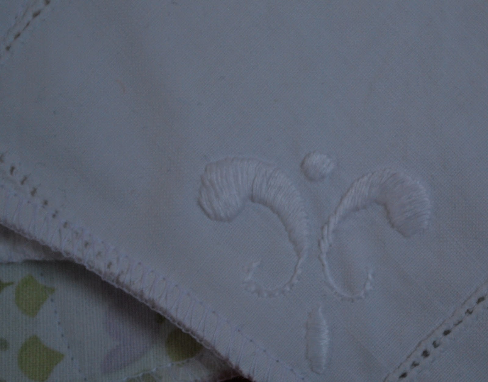 Denne kaffejakke var en lille ekstra ting. Jeg har syet i et gammelt pudebetræk med fint hulmønster og monogram.